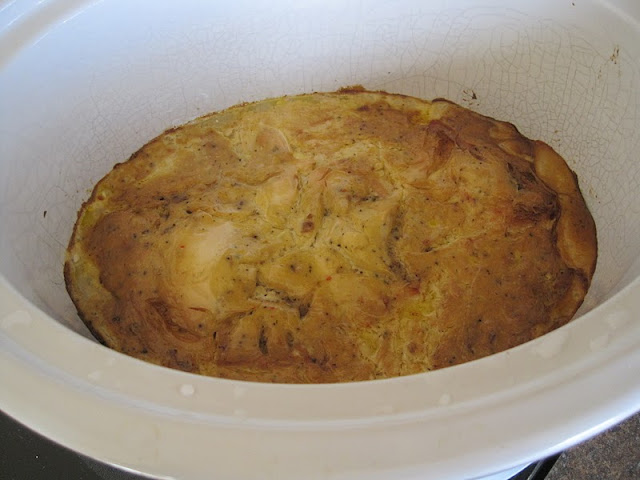 Cover. Sorry, I guess I forgot to clean the outside of our crock pot after last time. Heat on low all day. Or on medium/high for about 4 hours...I would keep checking it if you put it on high since I haven't tried it.