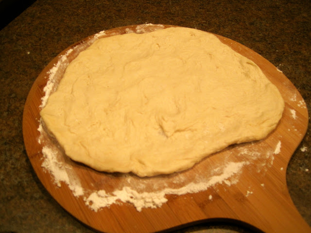 Start by flouring a pizza peel (or a baking sheet)Pull the dough into a semi-circular shape.